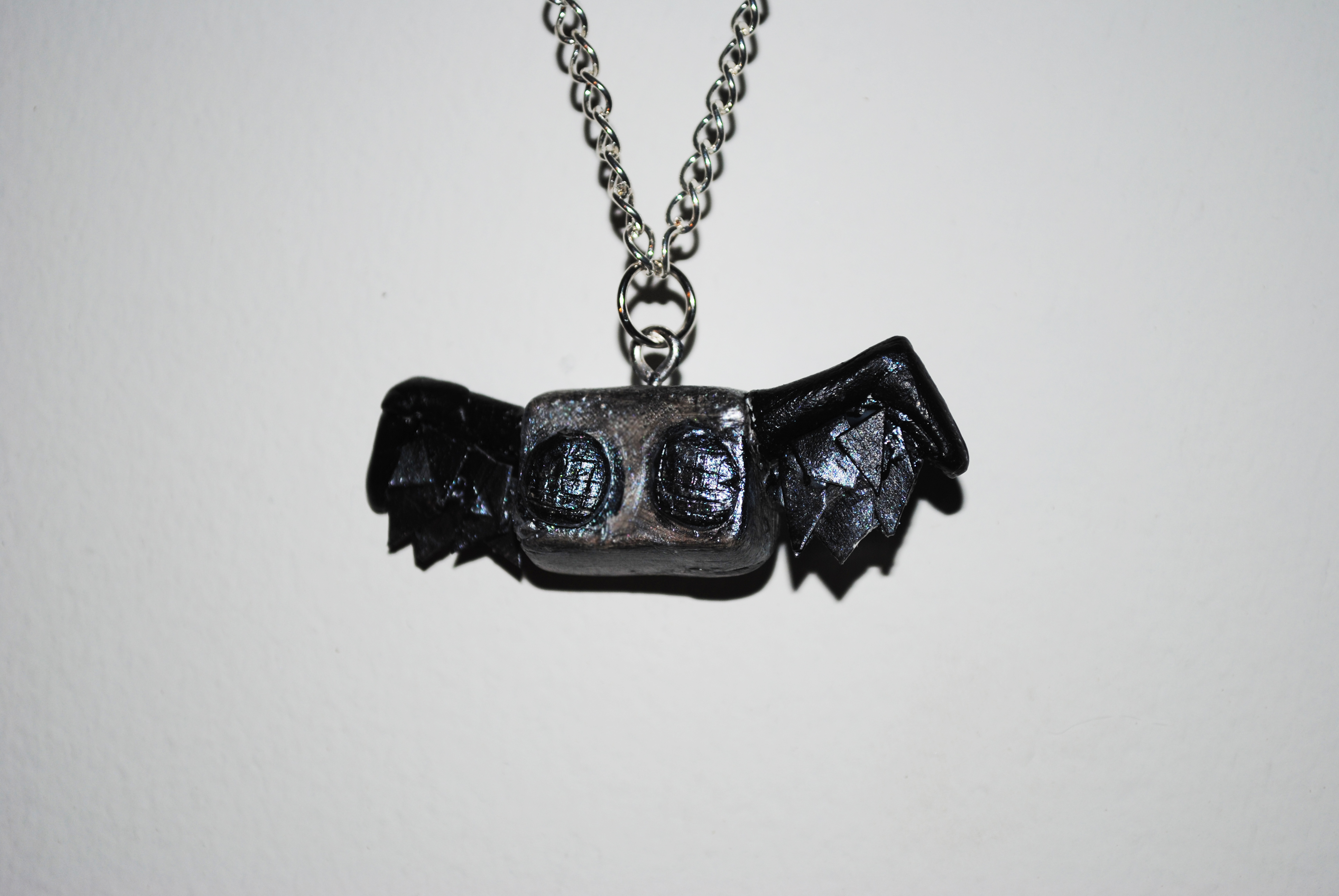 Featuring a silver base, an irridescent set of wings, and the Enochian word for "among the angels" carved in the back, this is the perfect gift for any Supernatural fan. Comes on silver, black, or gold chain